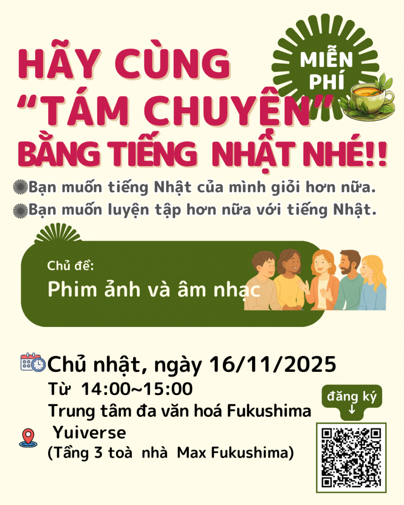 Bạn có muốn “tám chuyện”  với người Nhật không? Hãy cùng nhau nói chuyện bằng tiếng Nhật với nhiều chủ đề thú vị của từng tháng nhé! Nếu bạn muốn nâng cao trình độ tiếng Nhật, hãy đăng ký tham gia ngay và luôn!!