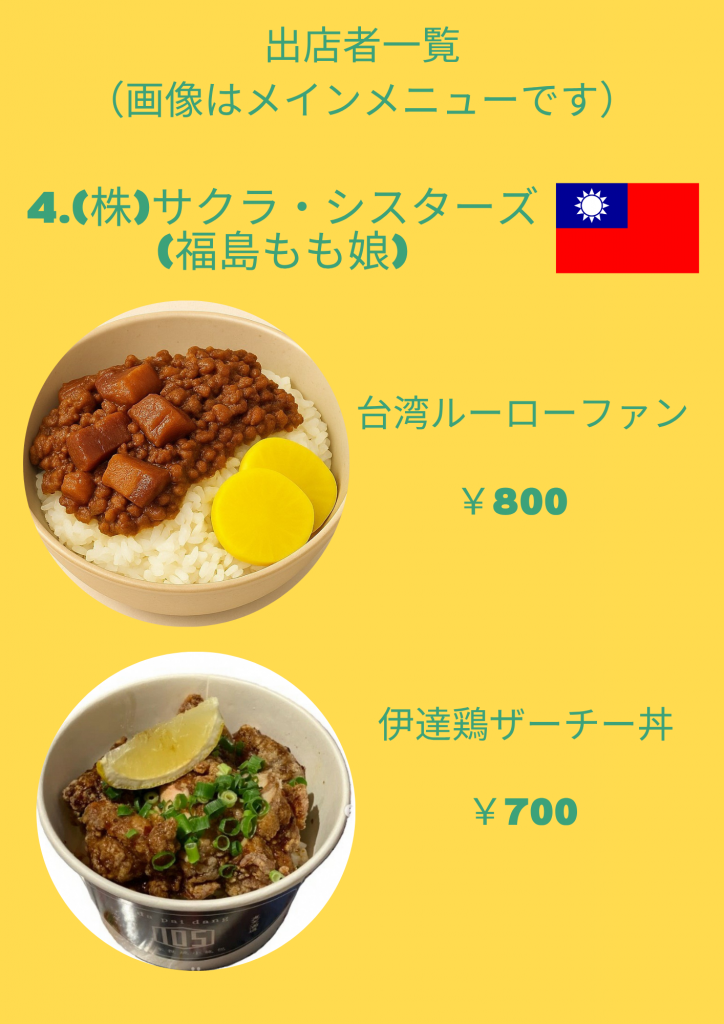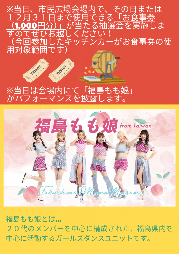 And there’s more! At the venue, the Taiwan-based idols that help promote Fukushima, “Momo Musume” will perform live from 12:00PM — please come watch their performance!