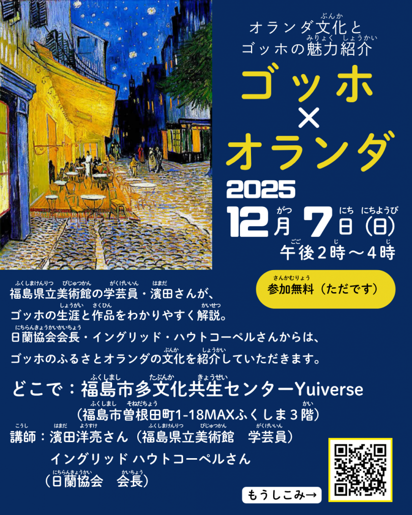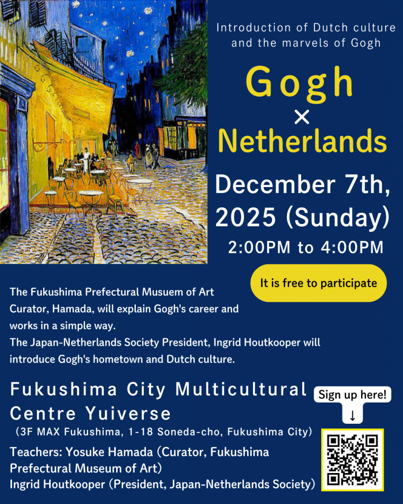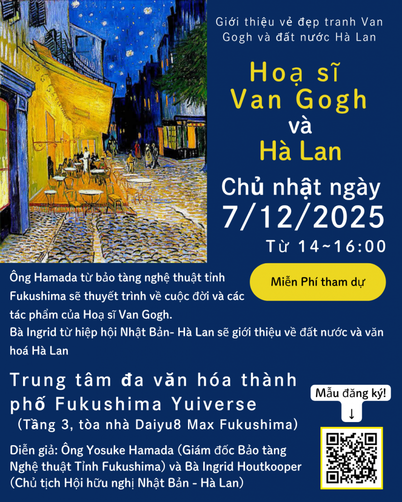 👩🏫 Ông Hamada từ bảo tàng nghệ thuật tỉnh Fukushima sẽ thuyết trình về cuộc đời và các tác phẩm của Hoạ sĩ Van Gogh.