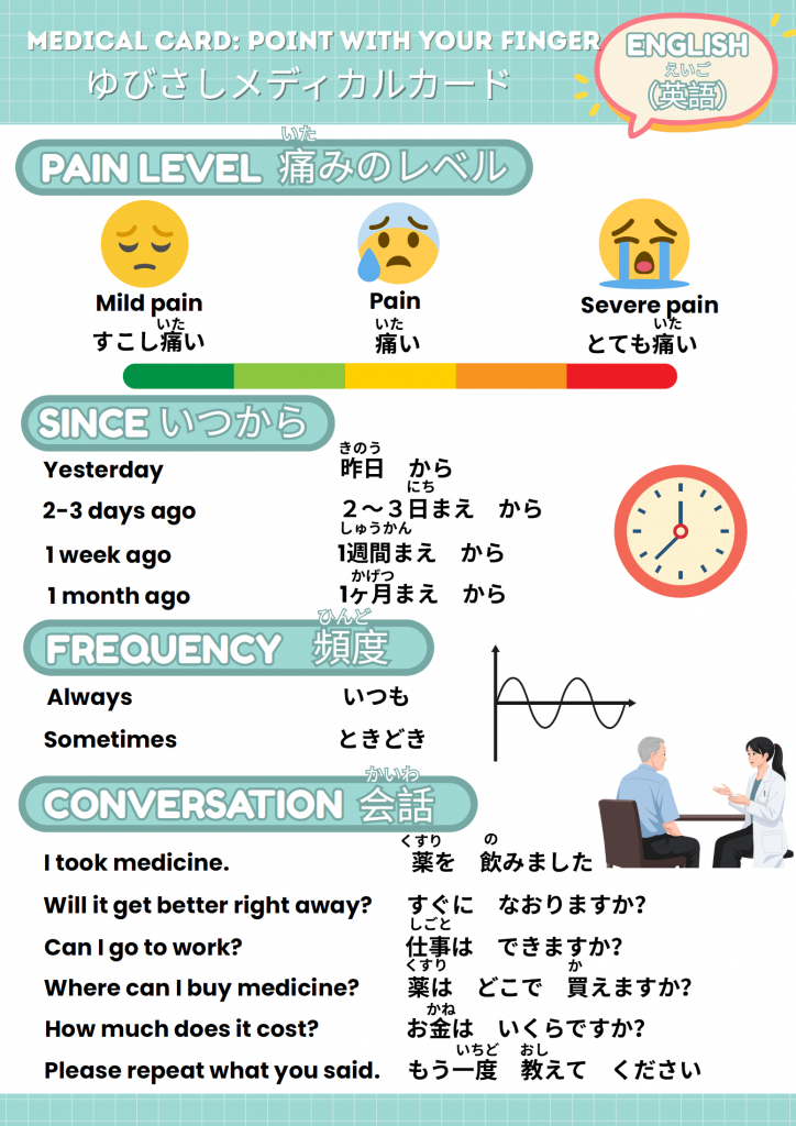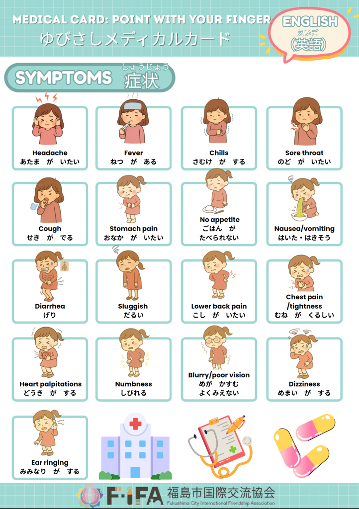 The Fukushima City International Friendship Association has created a “Medical Card: Point with Your Finger” chart in 12 different languages that can be used to help describe your symptoms at the doctor or hospital.Please feel free to use it.