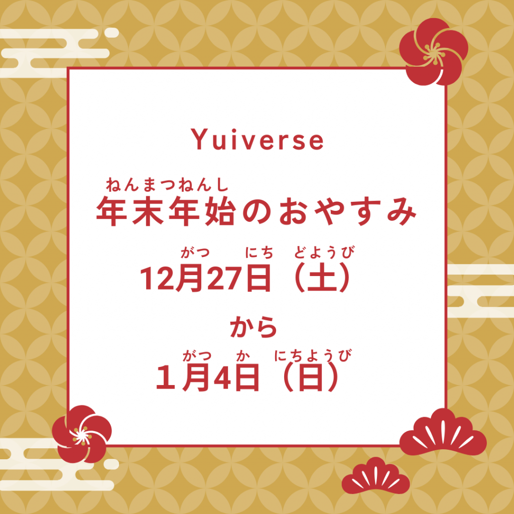 12月(がつ)27日(にち)から、1月(がつ)4日(か)まで、ユイバースはおやすみになります。