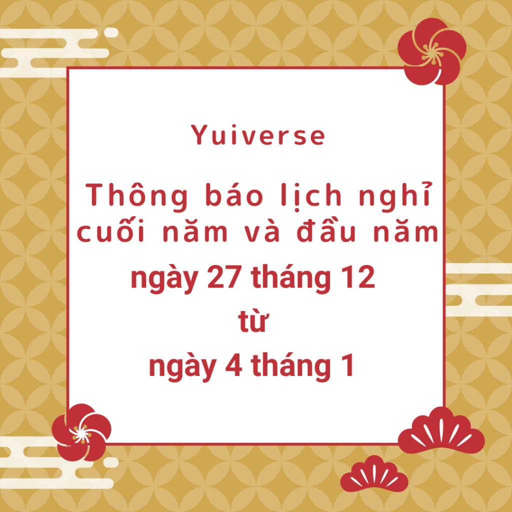 Yuiverse sẽ nghỉ Tết từ 27/12/2025 đến 04/01/2026. Chúc mọi người năm mới vui vẻ hạnh phúc nhé!